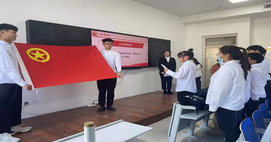 儀式在莊嚴(yán)的國(guó)歌聲中拉開序幕,首先由主持人宣讀了新團(tuán)員名單。隨后,團(tuán)總支老團(tuán)員代表向四名新團(tuán)員頒發(fā)團(tuán)證、佩戴團(tuán)徽。佩戴著嶄新的團(tuán)徽,四名新團(tuán)員在老團(tuán)員代表的帶領(lǐng)下,面對(duì)團(tuán)旗,握拳舉起右手,莊嚴(yán)宣誓:“我志愿加入中國(guó)共產(chǎn)主義青年團(tuán),堅(jiān)決擁護(hù)中國(guó)共產(chǎn)黨的領(lǐng)導(dǎo),遵守團(tuán)的章程,執(zhí)行團(tuán)的決議,履行團(tuán)員義務(wù),嚴(yán)守團(tuán)的紀(jì)律,勤奮學(xué)習(xí)……”新團(tuán)員的宣誓慷慨激昂,表達(dá)了他們堅(jiān)定的信念。宣誓過后,由入團(tuán)介紹人趙昱同學(xué)為新團(tuán)員宣讀團(tuán)員的權(quán)利與義務(wù)、團(tuán)員應(yīng)遵循的規(guī)章制度,隨后,新團(tuán)員代表尚哲龍和老團(tuán)員代表先后發(fā)言,老團(tuán)員代表發(fā)言中表達(dá)了對(duì)新團(tuán)員的熱烈祝賀和殷切希望,新團(tuán)員代表則表示一定時(shí)刻牢記入團(tuán)誓詞,刻苦學(xué)習(xí)、努力拼搏、爭(zhēng)取早日成為社會(huì)主義合格的建設(shè)者和可靠的接班人。